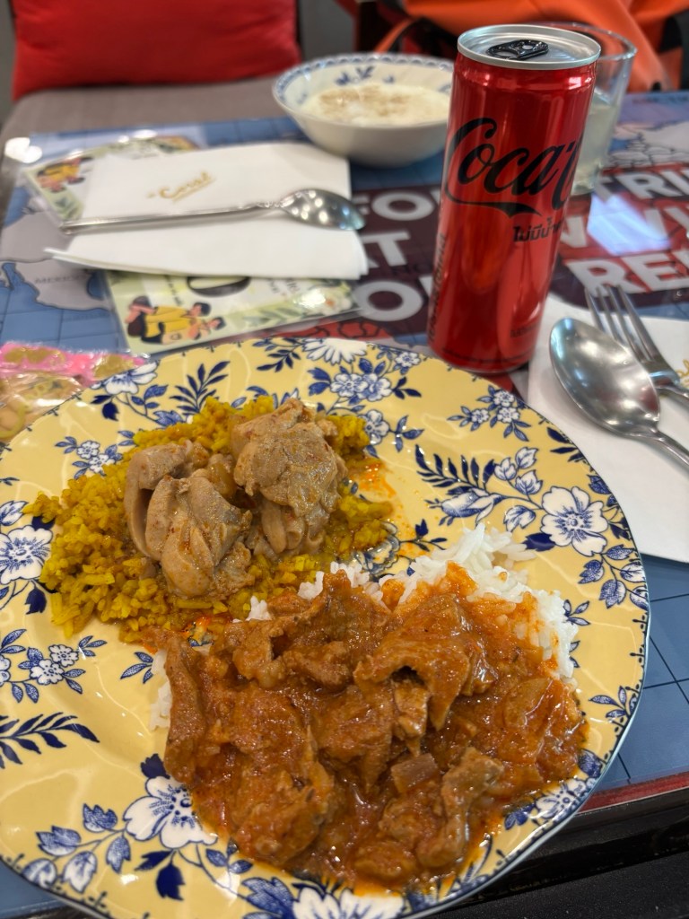 The food is ok here – I try the beef stroganoff and Massaman Curry – both are tasty, and then a few bits and pieces for dessert.