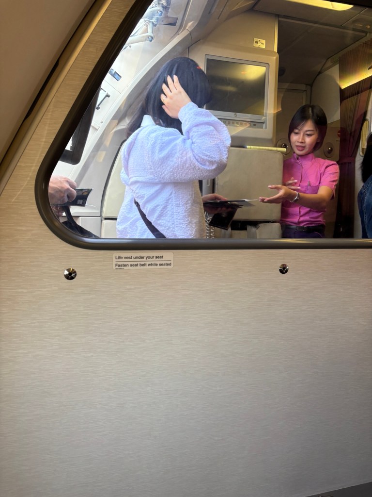 Upon boarding the flight attendant comes around to introduce herself and tells me the flight time will be one hour and today’s inflight meal is Chicken Noodles. She also asks if I’d like a drink and I tell her just water.