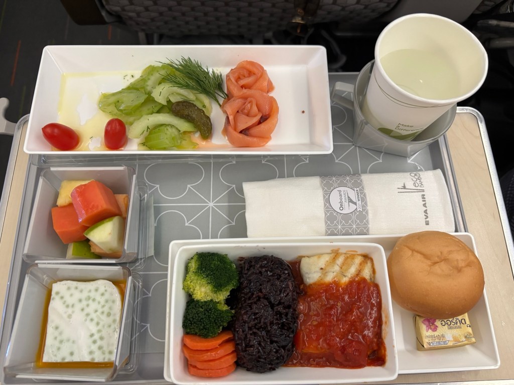 Service begins with a cold wet towel service, refreshing. Next is the main meal – I have pre-ordered a Seafood meal. It’s ok – fish and purple rice, smoked salmon, fruit, and a coconut mango pudding. I finish with a decaf coffee.