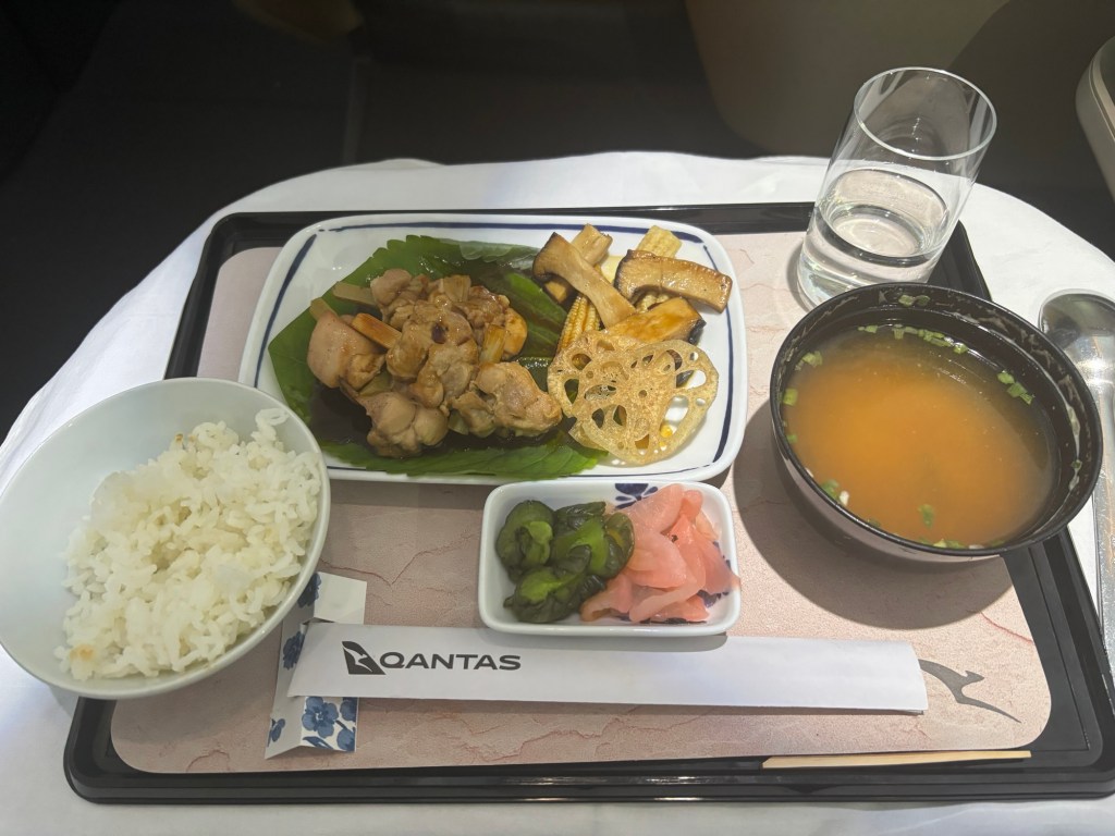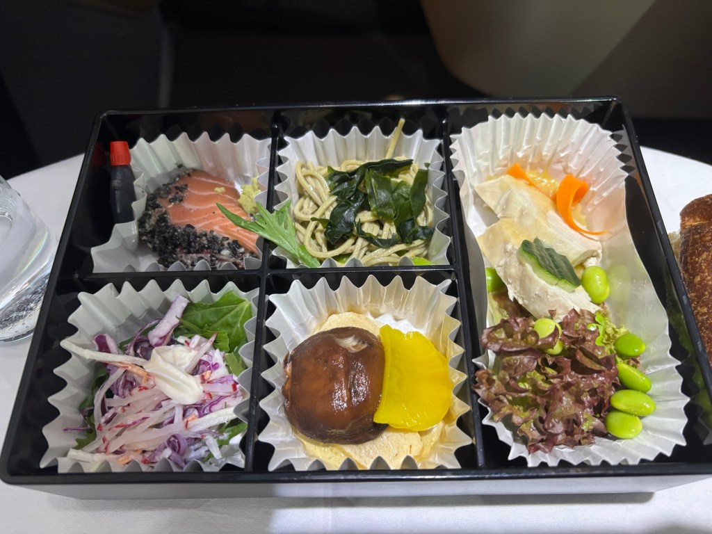 After being shown to my seat, we are offered a pre-flight drink and pajamas. I have sparkling water, and take a look through the menu. There is a Japanese bento box so decide that’s what I’ll have – a bit different from the normal airline meals.