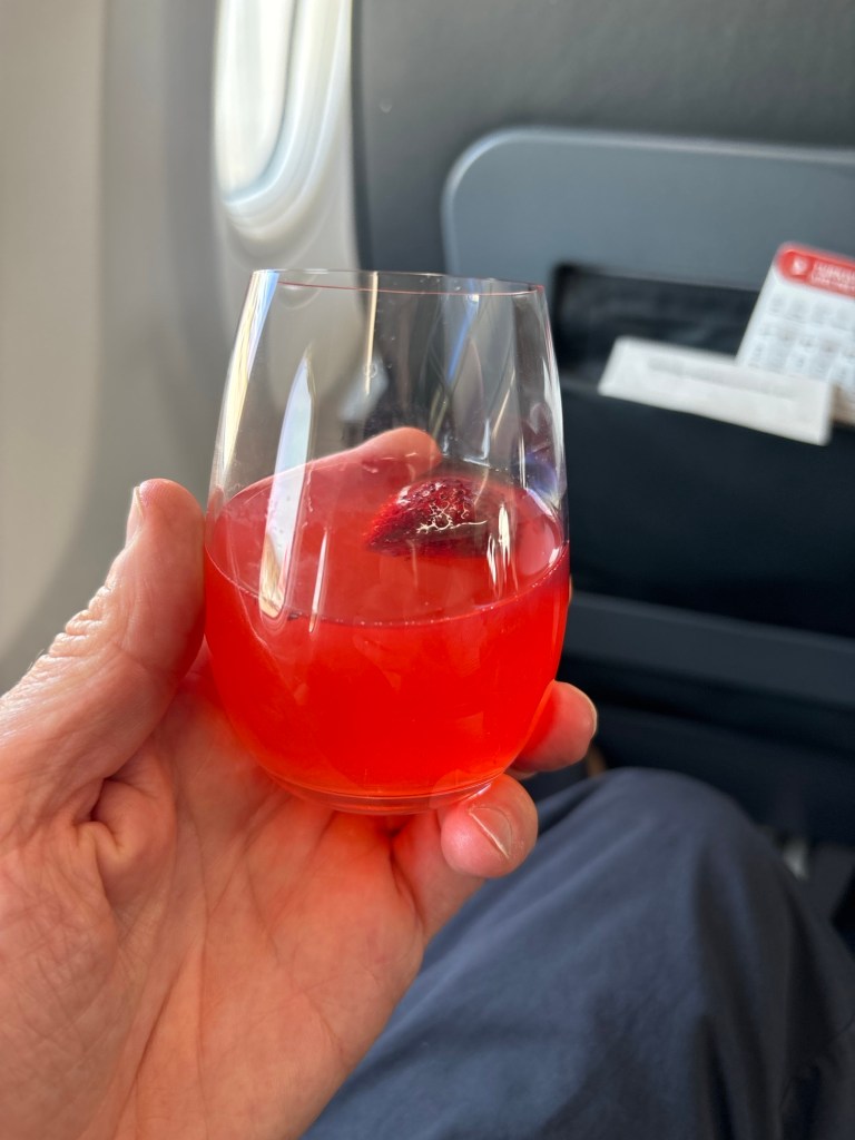 The departure time is delayed and we board after scheduled departure time. Service before take off begins with a drink. It’s a rose-berry juice whatever that is.