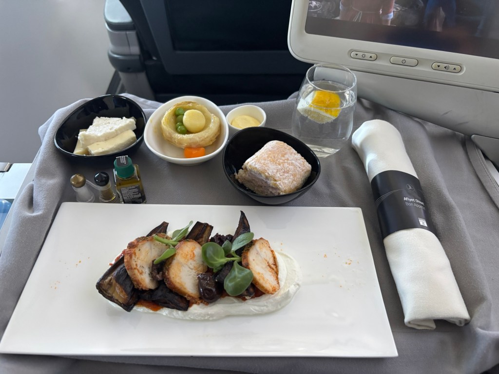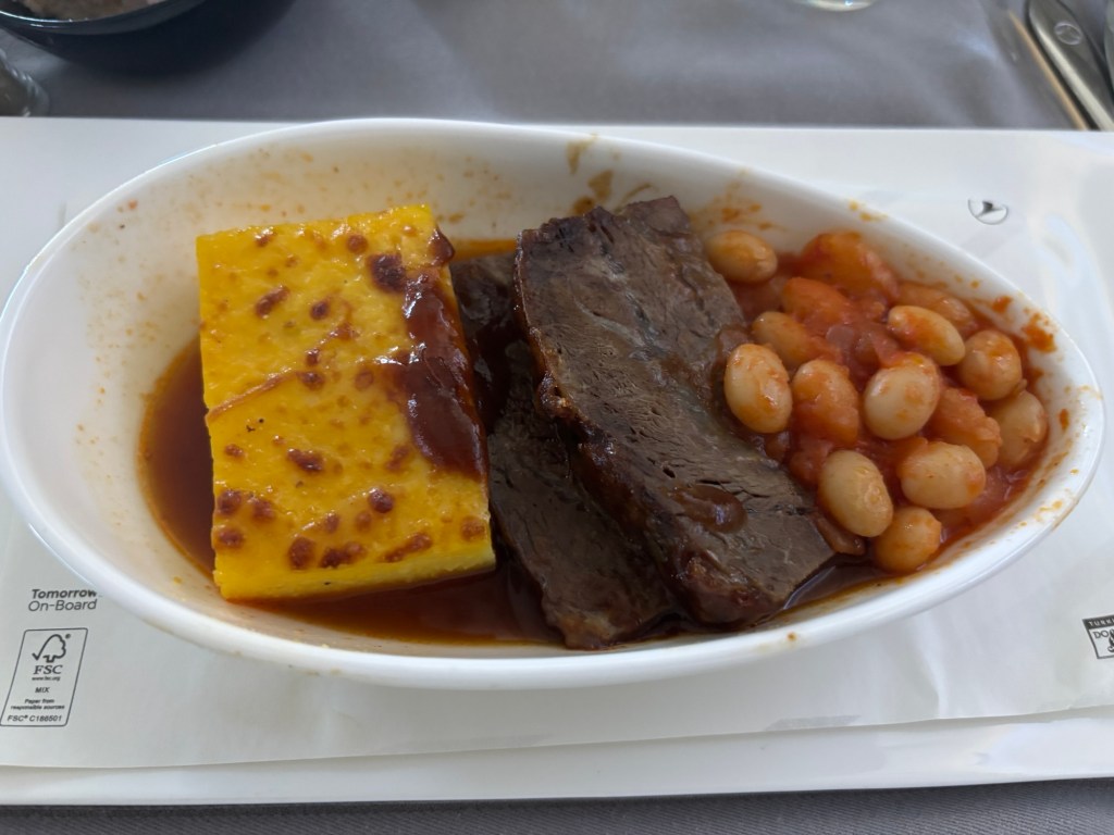 Next the menu is handed out and I choose the beef cheeks. I actually want the sea bream but fish is generally a bit hard and chewy on flights. The beef though is so tender and the polenta is delicious. The beans don’t work though.