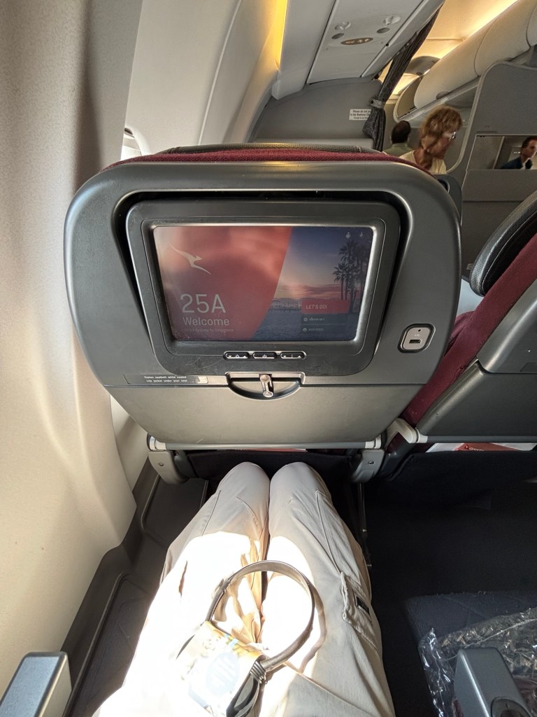 Compared to the flight from Haneda to Sydney, the seats are narrower and the AV screen half the size. This is an old aircraft. A few times my AV screen freezes and I have to ask the flight attendant to reset it.