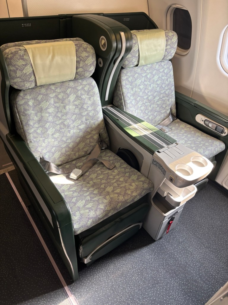 Slightly old-school, but comfortable lie-flat seats await us along with numerous nooks and crannies to store our stuff.