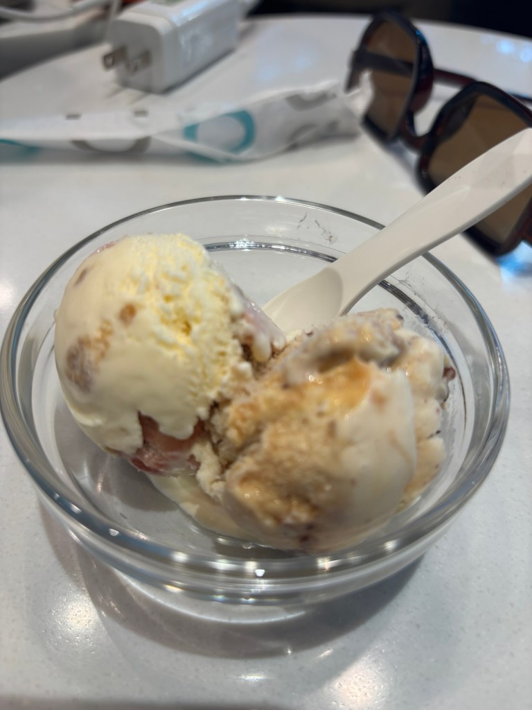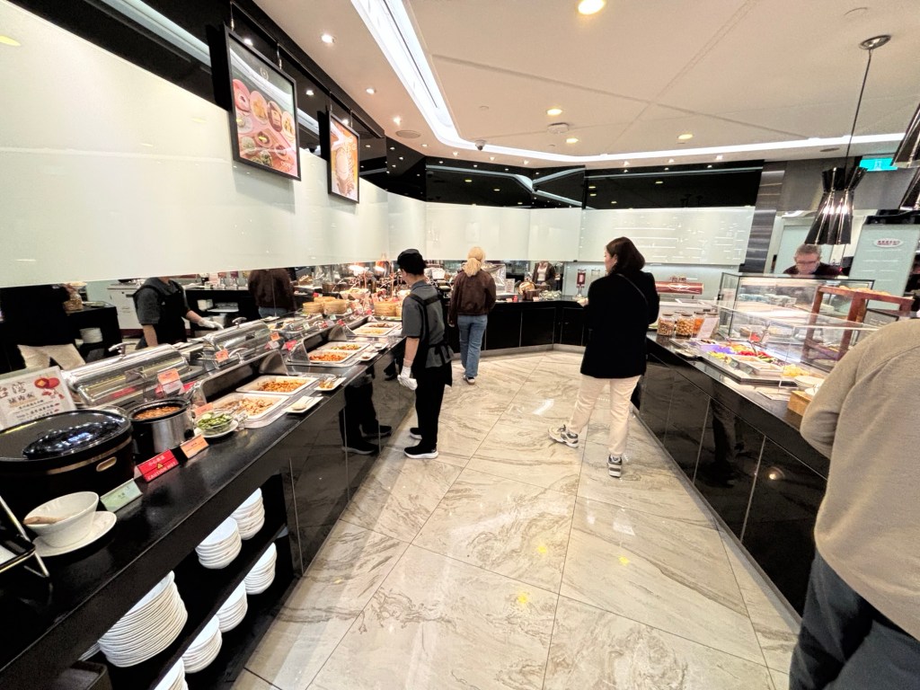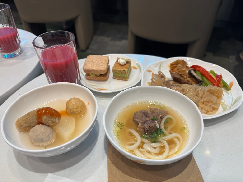 We find a couple of seats and make our way to the buffet. It’s quite big with a huge array of local and international fare. I have 牛肉麵 (beef noodle soup), Oden, chicken and vegetables, 2 delicious cakes, cold-pressed juice, and Hagan Daas ice cream. It is delicious. I don’t want to eat anymore as I’m about to have another feast on the plane.