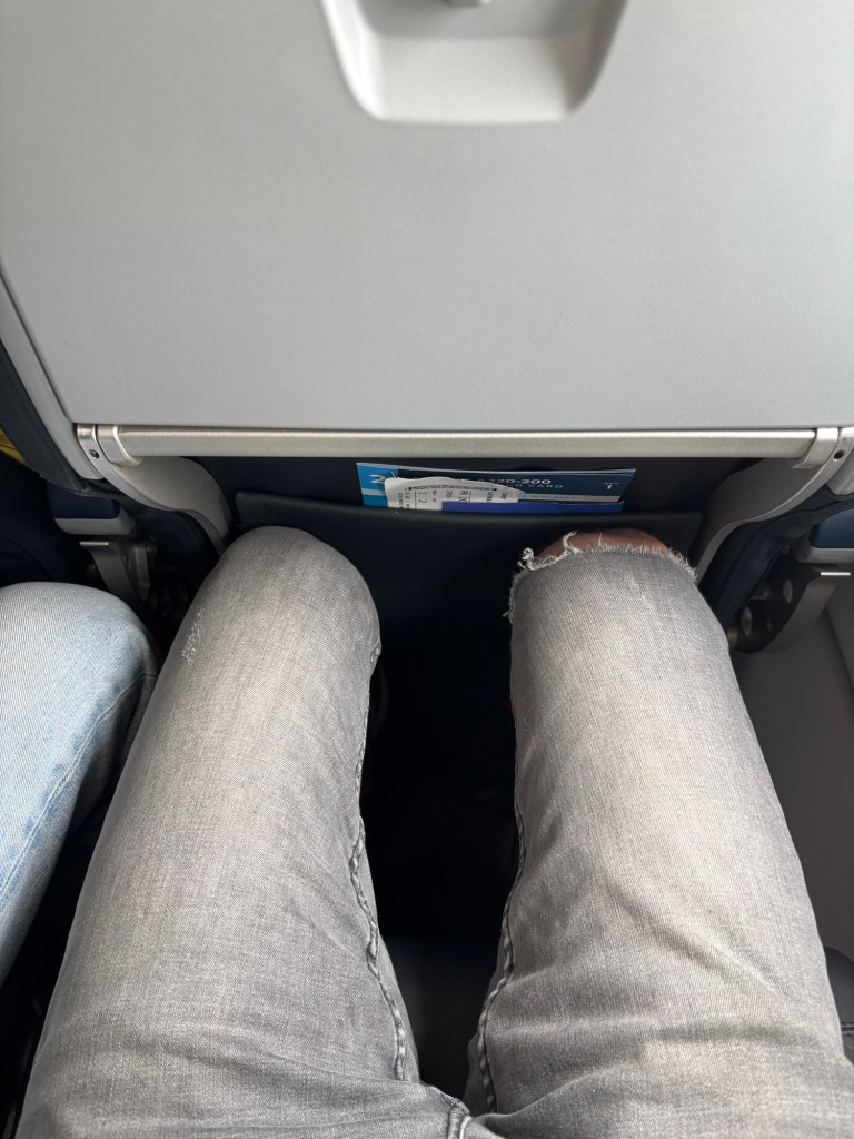 I am squashed into seat 37K, a window seat, on this Airbus A320-200 Philippine Airlines (PAL Express) flight from Manila to Caticlan (Boracay). This seat pitch would have to be worse than an LCC – around 73”?