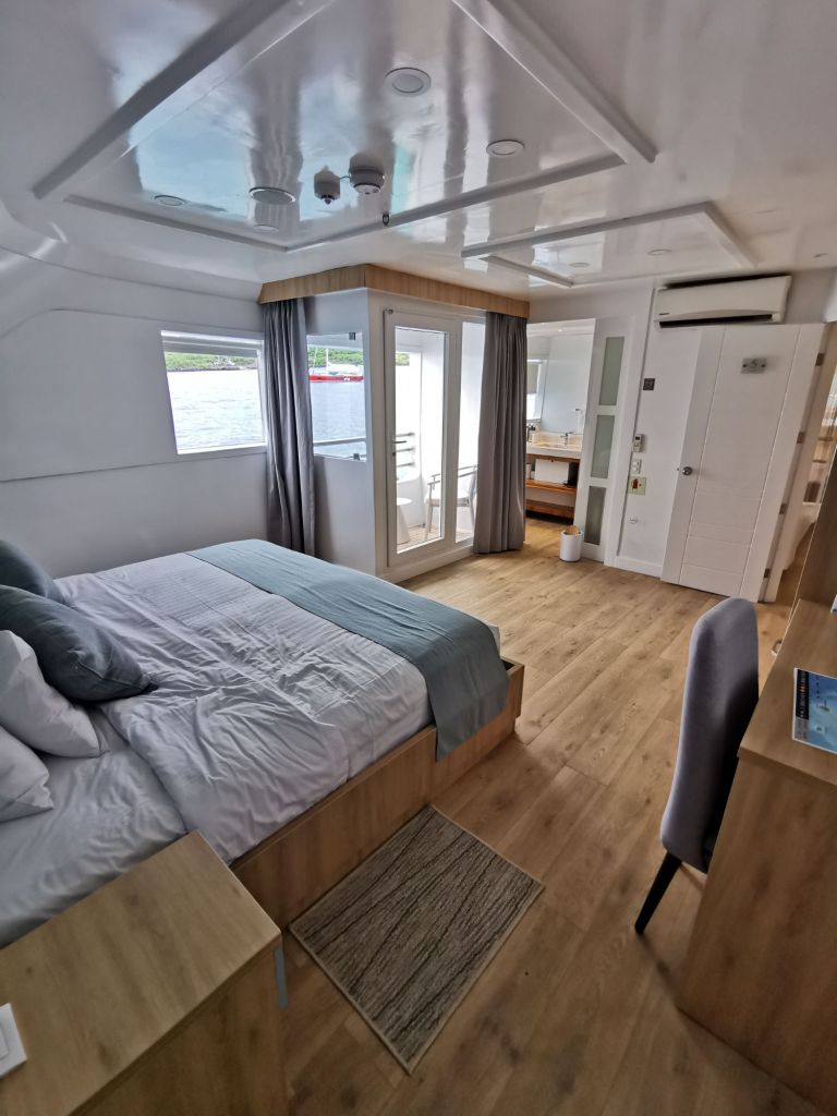 My room is at the front of the boat on the main deck, and it is huge, with a king-sized bed, large bathroom and balcony. Plenty of plugs and USB outlets to make sure all your devices are charged.