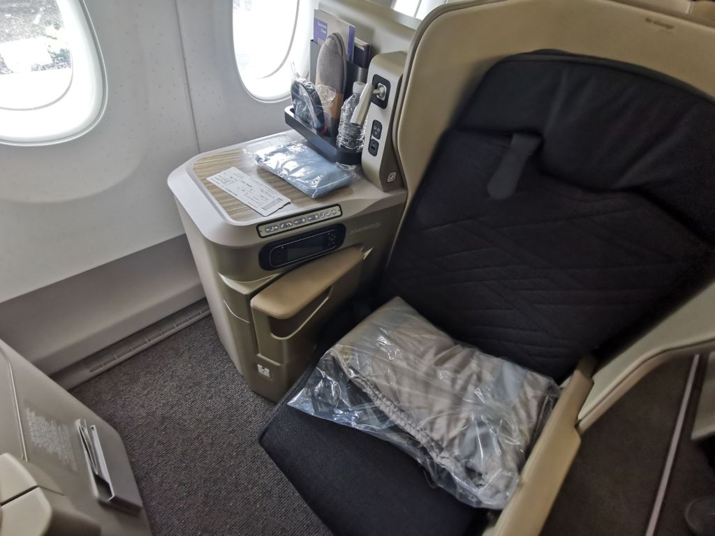 I am sitting in Business Class seat 3K on this Asiana Airlines A350-900 flight from New York to Seoul. It is the same plane as I flew coming over at the start of my trip. There is an amenity kit, pillow and blanket, as well as the meal and drinks menu in the seat pocket.