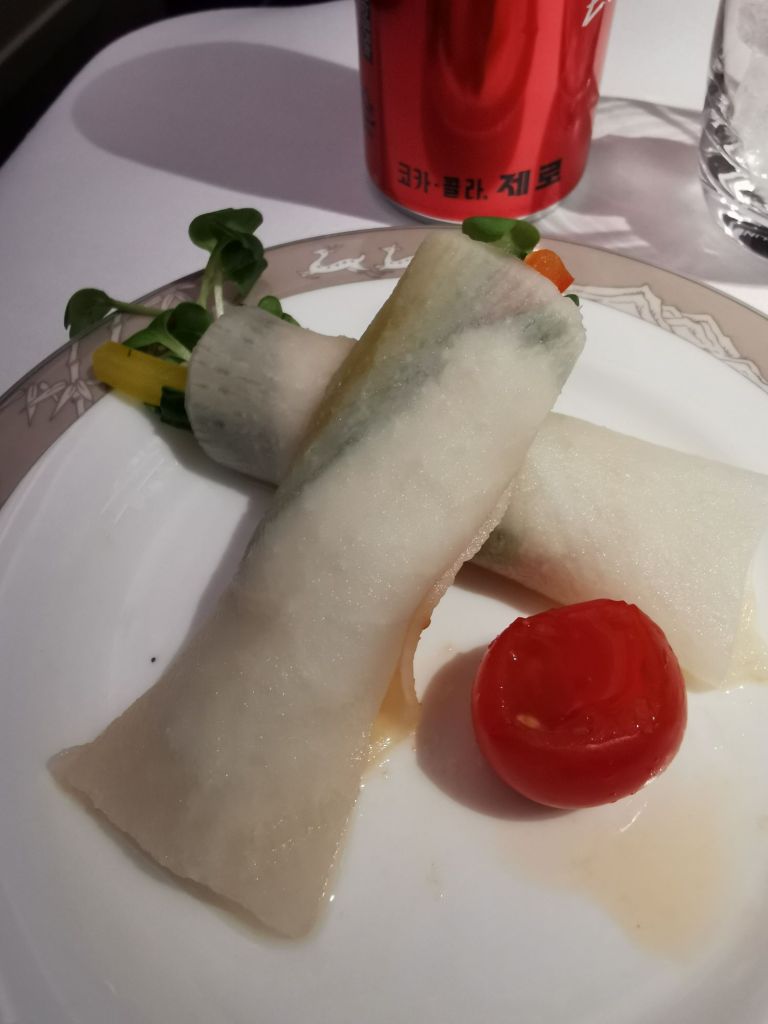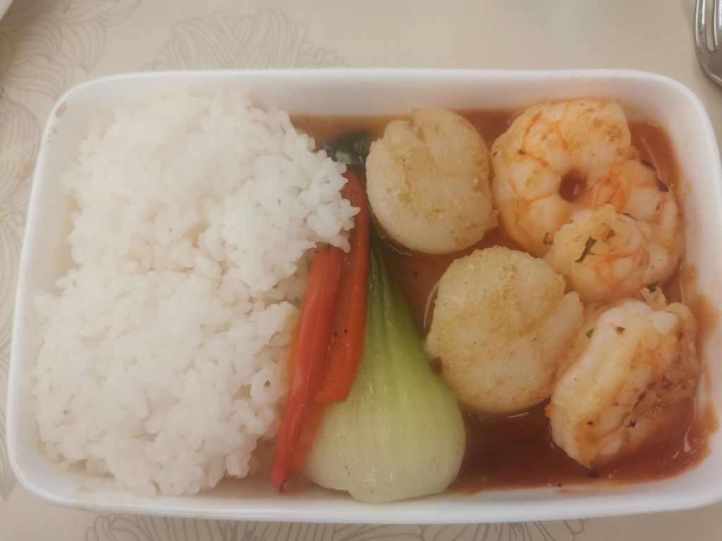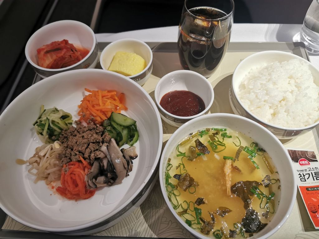Shortly after I take my seat, a flight attendant comes over to introduce herself and take my lunch order. I choose the Korean Bibimbap course – healthy and delicious.