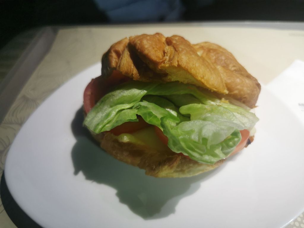Well that’s the plan but after a few minutes of realising I can’t sleep, I watch another movie and choose a couple of items from the snack menu including a delicious heated, crispy croissant with Gruyere cheese.